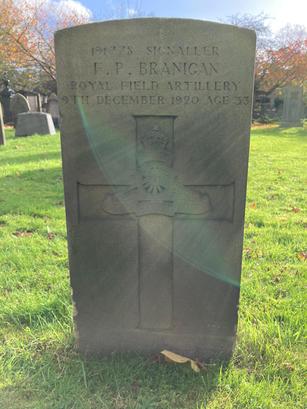 191778 Signaller F. P. Branigan Royal Field Artillery 9th December 1920 Age 33 Large cross underneath with the regimental insignia in the centre of the cross