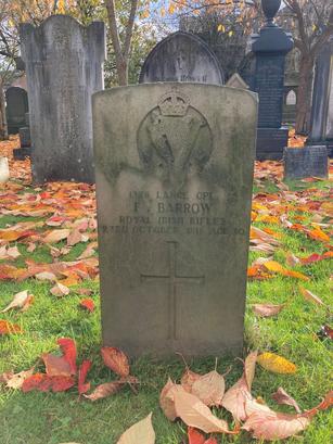 Regimental insignia above lettering, "1378 Lance Cpl. F. Barrow Royal Irish Rifles 23rd October 1916 Age 30" A cross below.