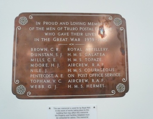 IN PROUD AND LOVING MEMORY/ OF THE MEN OF TRURO POSTAL DISTRICT/ WHO GAVE THEIR LIVES/ IN THE GREAT WAR 1939 - 1945/ (names)
