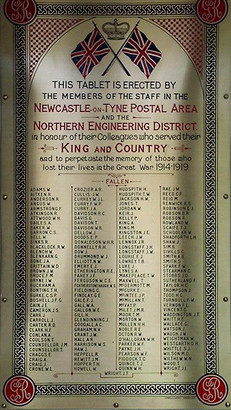 THIS TABLET IS ERECTED BY/ THE MEMBERS OF THE STAFF IN THE/ NEWCASTLE UPON TYNE POSTAL AREA/ AND THE/ NORTHERN ENGINEERING DISTRICT/ IN HONOUR OF THEIR COLLEAGUES WHO SERVED THEIR/ KING AND AND COUNTRY/ AND TO PERPETUATE THE MEMORY OF THOSE WHO/ LOST THEIR LIVES IN THE GREAT WAR 1914 - 1918/ FALLEN/(153 names)