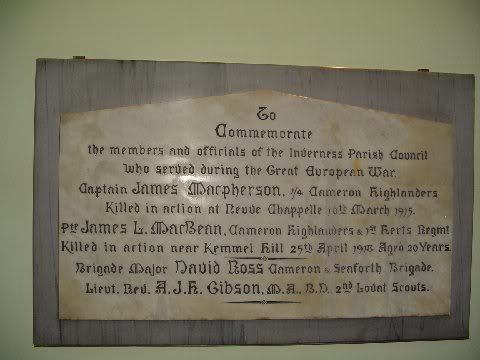 THE GLORIOUS MEMORY OF THE MEN AND / WOMEN OF THE BURGH AND PARISH WHO MADE / THE SUPREME SACRIFICE IN DEFENCE OF / THEIR COUNTRY IN THE SECOND WORLD WAR / ROLL OF HONOUR / 1939 1945 / (names on three panels each with two columns) Right hand panels (two)-TO THE GLORIOUS/MEMORY OF THE MEN/OF THE BURGH AND/PARISH OF INVERNESS/WHO LAID DOWN THEIR/LIVES IN THE GREAT WAR/1914-1919/[names in 6 columns]