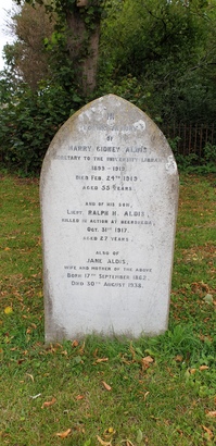 IN / LOVING MEMORY / OF / HARRY GIDNEY ALDIS / SECRETARY TO THE UNIVERSITY LIBRARY / 1899 - 1919 / DIED FEB 24TH 1919 / AGED 55 YEARS / AND OF HIS SON / LIEUT RALPH H ALDIS / KILLED IN ACTION AT BEERSHEBA / OCT 31ST 1917 / AGED 27 YEARS / ALSO OF / JANES ALDIS / WIFE AND MOTHER OF THE ABOVE / BORN 17TH SEPTEMBER 1862 / DIED 30TH AUGUST 1938