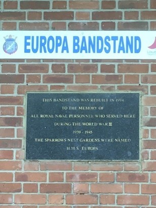 THIS BANDSTAND WAS REBUILT IN 1994 / TO THE MEMORY OF / ALL ROYAL NAVAL PERSONNEL WHO SERVED HERE / DURING THE WORLD WAR II / 1939 - 1945 / THE SPARROWS NEST GARDEN WERE NAMED / HMS EUROPA