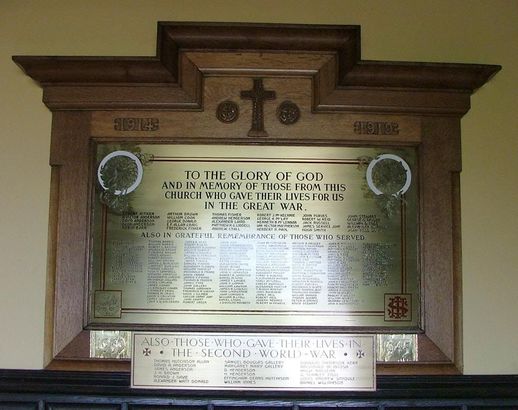 Top of frame: 1914 + 1919 WW1 Plaque: TO THE GLORY OF GOD/AND IN MEMORY OF THOSE FROM THIS/CHURCH WHO GAVE THEIR LIVES FOR US/IN THE GREAT WAR/[names in 6 columns]/ALSO IN GRATEFUL REMEMBRANCE OF THOSE WHO SERVED/[names in 8 columns] WW2 Plaque: +ALSO THOSE WHO GAVE THEIR LIVES IN THE/SECOND WORLD WAR/[names in 3 columns]