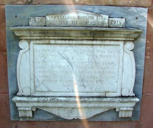 On the Pediment: 1914 CAMBUSLANG BOWLING CLUB/WAR MEMORIAL 1919/ On the Tablet- TO THE MEMORY OF THOSE WHO FELL/[names]/TO THE HONOUR OF THOSE WHO SERVED/[names in 2 columns]
