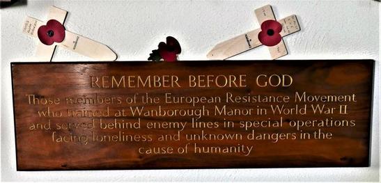 REMEMBER BEFORE GOD/ THOSE MEMBERS OF THE EUROPEAN RESISTANCE MOVEMENT/ WHO TRAINED AT WANBOROUGH MANOR IN WORLD WAR II/ AND SERVED BEHIND ENEMY LINES IN SPECIAL OPERATIONS/ FACING LONELINESS AND UNKNOWN DANGERS IN THE/ CAUSE OF HUMANITY