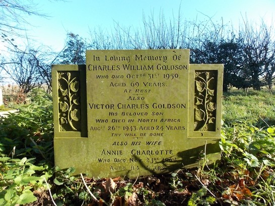 In Loving Memory of / Charles William Goldson, / Who died Octbr 31st 1950, / Aged 69 years. / At Rest. / ---- / Also / Victor Charles Goldson, / His beloved son / Who died in North Africa / Augst 26th 1943. aged 24 years. / Thy will be done. / ------- / Also his wife / Annie Charlotte / Who died Novbr 23rd 1964. / Aged 84 years.
