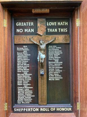 On Closed Doors: FOR GOD KING & COUNTRY; Inside: GREATER LOVE HATH NO MAN THAN THIS/ (names)/SHEPPERTON ROLL OF HONOUR