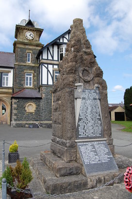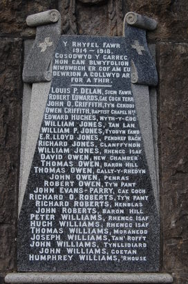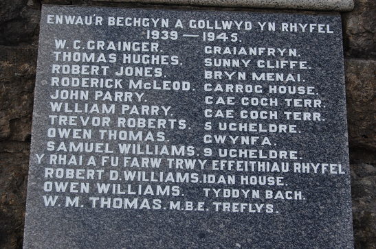 Y RHYFEL FAWR / 1914 - 1918. / GOSODWYD Y GARREG / HON GAN BLWYFOLION / NIWBWRCH ER COF AM EU / DEWRION A GOLLWYD AR / FOR A THIR. / (26 WW1 names) [Translation- THE GREAT WAR/1914-1918. /THE STONE/THIS HAS BEEN LAID BY PARISHIONERS/NEWBOROUGH IN MEMORY OF THEIR/THEIR LOST ON/FOR AND LAND.] ENWAUR BECHGYN A GOLLWYD YN RHYFEK[Translates- our boys lost at war] / 1939 - 1945. / (9 WW2 names) / Y RHAI A FU FARW TRWY EFFEITHIAU RHYFEL [Translates- Those who died through the effects of war] / (3 WW2 names) IR BEWRION/ (NAMES)/ 1939 - 1945/ (NAMES) ?)