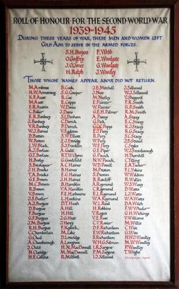 ROLL OF HONOUR FOR THE SECOND WORLD WAR/ 1939 - 1945/ DURING THESE YEARS OF WAR, THESE MEN AND WOMEN LEFT/ COLD ASH TO SERVE IN THE ARMED FORCES./ (Names)/ THOSE WHOSE NAMES APPEAR ABOVE DID NOT RETURN/ (Names)