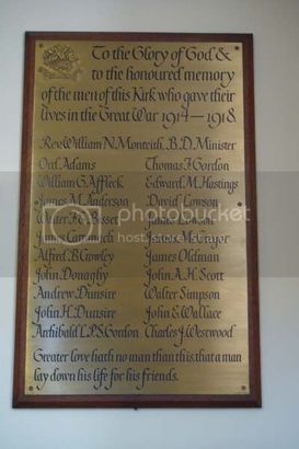 To the Glory of God &/ to the honoured memory/ of the men of this kirk who gave their/ lives in the Great War 1914 - 1918./ (21 Names)/ Greater love hath no man than this that a man/ lay down his life for his friends.