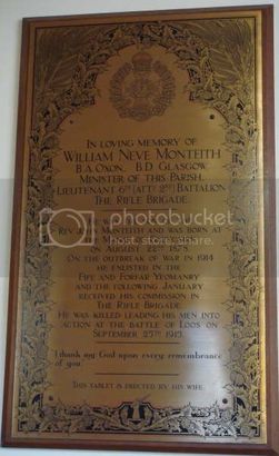 IN LOVING MEMORY OF/ WILLIAM NEVE MONTEITH/ BA OXON. B.D. GLASGOW/ MINISTER OF THIS PARISH,/ LIEUTENANT 6TH (ATTA. 2ND) BATTALION/ THE RIFLE BRIGADE/ HE WAS THE SON OF THE/ REV. JOHN MONTEITH AND WAS BORN AT/ THE MANSE OF GLENCAIRN/ ON AUGUST 22ND 1878./ ON THE OUTBREAK OF WAR IN 1914/ HE ENLISTED IN THE FIFE AND FORFAR YEOMANRY/ AND THE FOLLOWING JANUARY/ RECEIVED HIS COMMISSION IN/ THE RIFLE BRIGADE/ HE WAS KILLED LEADING HIS MEN INTO/ ACTION AT THE BATTLE OF LOOS ON/ SEPTEMBER 25TH 1915/ I THANK MY GOD UPON EVERY REMEMBERANCE OF YOU/ THIS TABLET WAS ERECTED BY HIS WIFE.