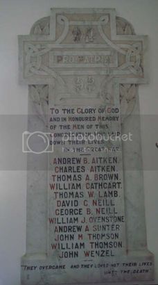 TO THE GLORY OF GOD/ AND IN HONOURED MEMORY/ OF THE MEN OF THIS/ CONGREGATION WHO LAID/ DOWN THEIR LIVES/ IN THE GREAT WAR/ (12 names)/ THEY OVERCAME AND THEY LOVED NOT THEIR LIVES/ UNTO THE DEATH
