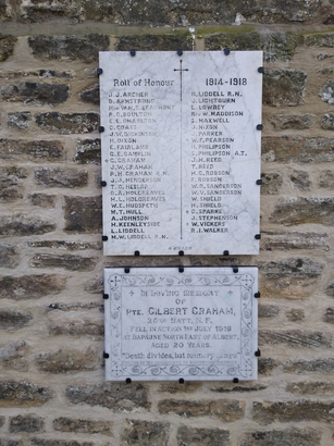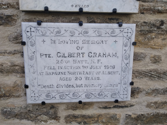 + IN LOVING MEMORY +/ OF/ PTE. GLIBERT GRAHAM/ 25TH BATT. N.F.,/ FELL IN ACTION 1ST JULY 1916/ AT BAPAUNE (sic) NORTH EAST OF ALBERT,/ AGED 20 YEARS./ "DEATH DIVIDES, BUT MEMORY CLINGS"/ ERECTED BY THE INHABITANTS OF SINDERHOPE DISTRICT