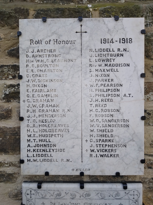 ROLL OF HONOUR 1914-1918 + Killed J J. ARCHER D. ARMSTRONG HON W. H. C. BEAUMONT R. C. BOULTON E. E. CHARLTON C. COATS J. W. DICKINSON H. DIXON E. FAIRLAMB G. E. GAMBLIN + G. GRAHAM J. W. GRAHAM R. H. GRAHAM R.N. J. J. HENDERSON T. C. HESLOP D. A. HOLGREAVES H. L. HOLGREAVES W. E. HUDSPETH M. T. HULL A. JOHNSON H. KEENLEYSIDE L. LIDDELL M. W. LIDDELL R.N. N. LIDDELL R.N. J. LIGHTBURN L. LOWREY REV W. MADDISON S. MAXWELL J. NIXON J. PARKER + W. F. PEARSON H. PHILIPSON S. PHILIPSON A.T. J. H. REED T. REED H. C. RONSON F. ROBSON W. D. SANDERSON W. V. SANDERSON W. SHIELD H. SHIELD + C. SPARKE J. STEPHENSON + W. VICKERS R. I. WALKER