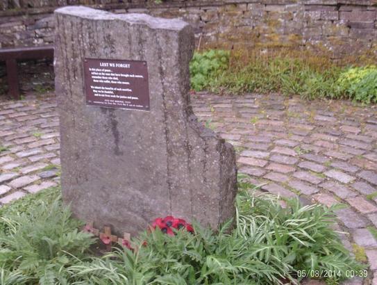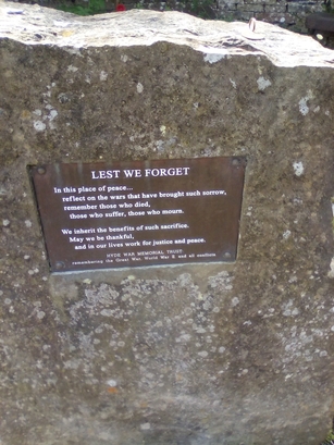 LEST WE FORGET/ In this place of peace/ reflect on the wars that have brought such sorrow,/ remember those who died,/ those who suffer, those who mourn./ We inherit the benefits of such sacrifice,/ may we be thankful,/ and our lives work for justice and peace/ HYDE WAR MEMORIAL TRUST/ remembering the Great War, World War II and all conflicts