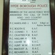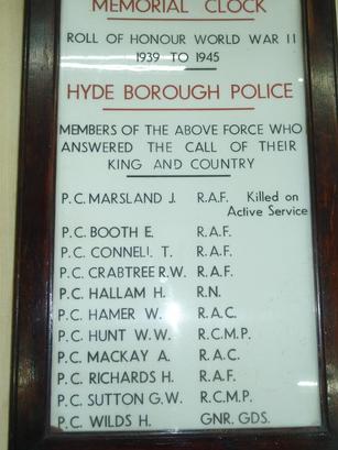 MEMORIAL CLOCK/ ROLL OF HONOUR WORLD WAR II/ 1939 TO 1945/ HYDE BOROUGH POLICE/ MEMBERS OF THE ABOVE FORCE WHO/ ANSWERED THE CALL OF THEIR/ KING AND COUNTRY/ (11 names)