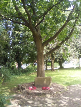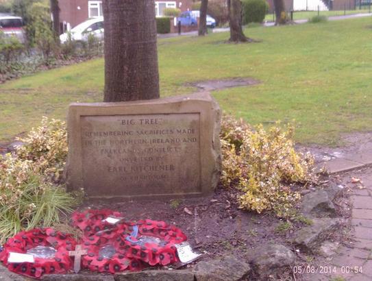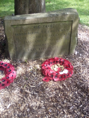 "BIG TREE"/ REMEMBERING SACRIFICES MADE/ IN THE NORTHERN IRELAND AND/ FALKLANDS CONFLICTS/ UNVEILED BY/ EARL KITCHENER/ OF KHARTOUM/ APRIL 1983.