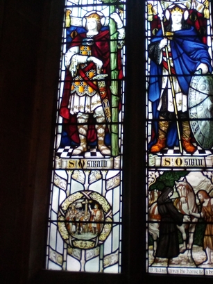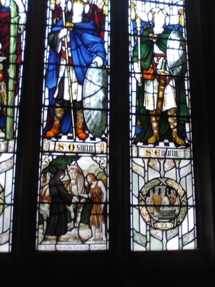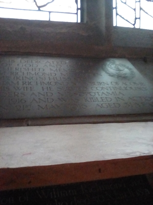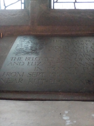 THIS WINDOW IS DEDICATED TO THE/ GLORY OF GOD AND IN/ PROUD AND CHERISHED MEMORY OF/ SIMON WILLIAM RICHMOND MEWBURN/ CAPTAIN 14TH (KING'S) HUSSARS/ THE BELOVED SON OF WILLIAM RICHMOND MEWBURN OF ACOMB/ AND ELIZABETH FANNY HIS WIFE. HE SERVED CONTINUOUSLY/ IN FRANCE, FLANDERS AND MESOPOTAMIA/ FROM SEPTEMBER 1914 TIL MAY 1916 AND WAS KILLED IN ACTION/ NEAR KUT-EL-AMARA OM MAY 21ST 1916 AGED 31 YEARS