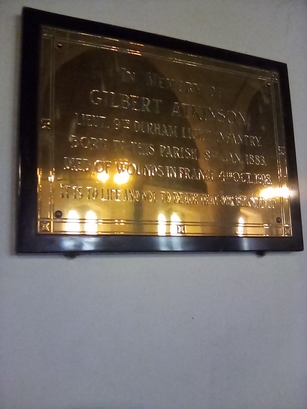 IN MEMORY OF/ GILBERT ATKINSON/ LIEUT. 9TH DURHAM LIGHT INFANTRY/ BORN IN THIS PARISH 8TH JAN. 1883/Died of wounds in France 4th Oct. 1918/ IT IS TO LIFE AND NOT TO DEATH THAT OUR BELOVED GO