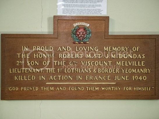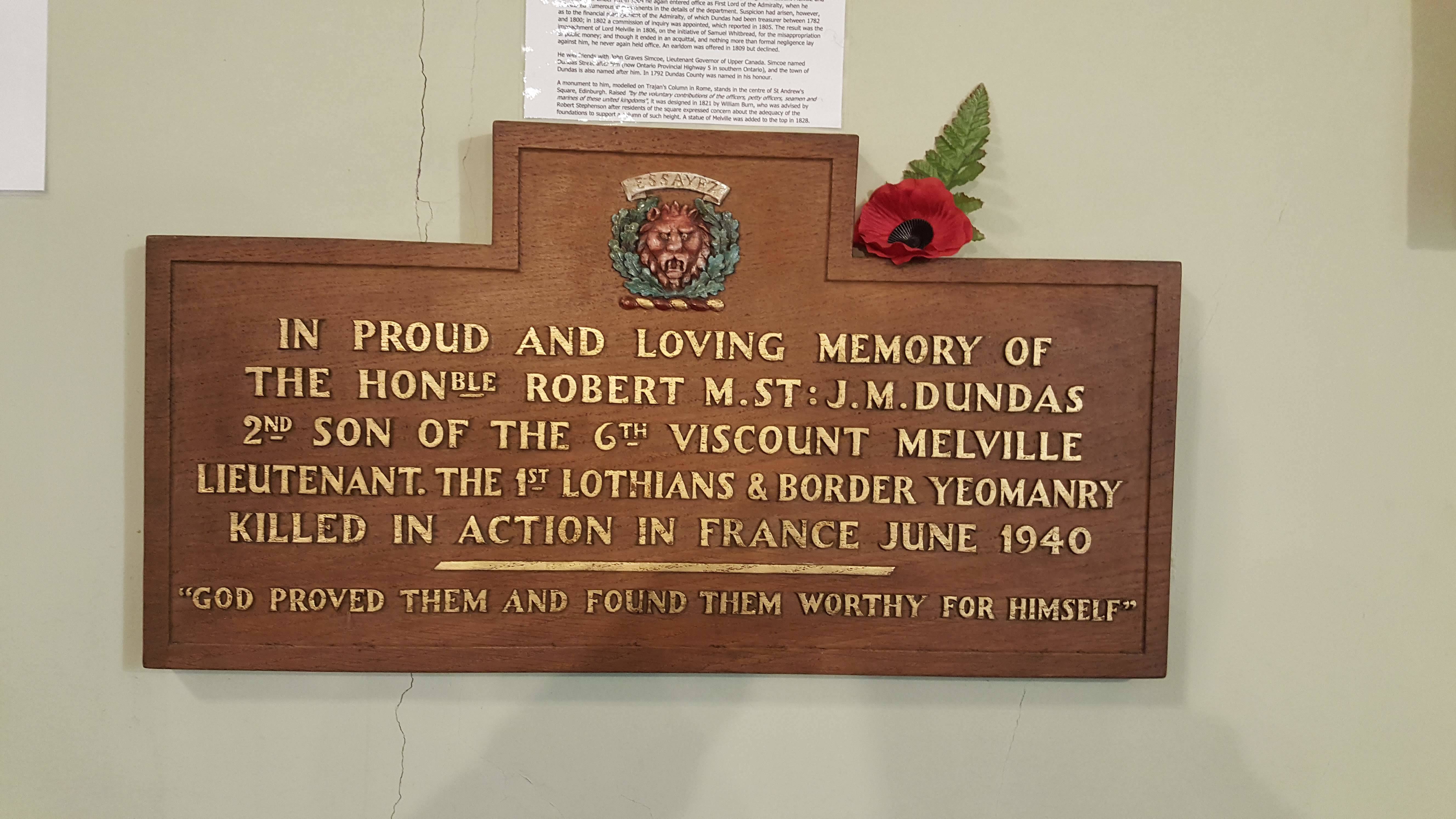 IN PROUD AND LOVING MEMORY OF/THE HONBLE. ROBERT M. ST: J.M. DUNDAS/2ND. SON OF THE 6TH VISCOUNT MELVILLE/LIEUTENANT THE 1ST LOTHIANS & BORDER YEOMANRY/KILLED IN ACTION IN FRANCE JUNE 1940/"GOD PROVED THEM AND FOUND THEM WORTHY FOR HIMSELF"