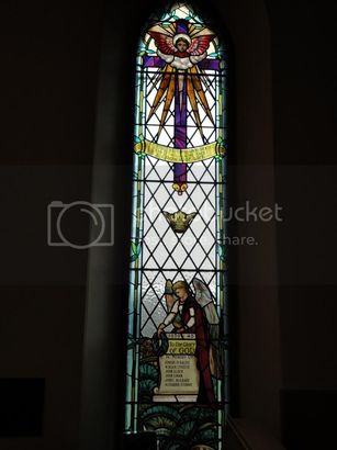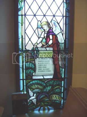 Top of window: BE THOU FAITHFUL UNTO DEATH/AND I WILL GIVE THEE/A CROWN OF LIFE Bottom of window: 1939-45/To the Glory/of GOD/IN MEMORY OF/[6 names]