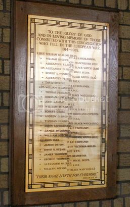 TO THE GLORY OF GOD/AND IN LOVING MEMORY OF THOSE/CONNECTED WITH THIS CONGREGATION/WHO FELL IN THE EUROPEAN WAR/1914-1918/[25 names]/"THEIR NAME LIVETH FOR EVERMORE"