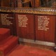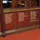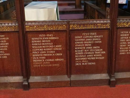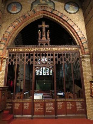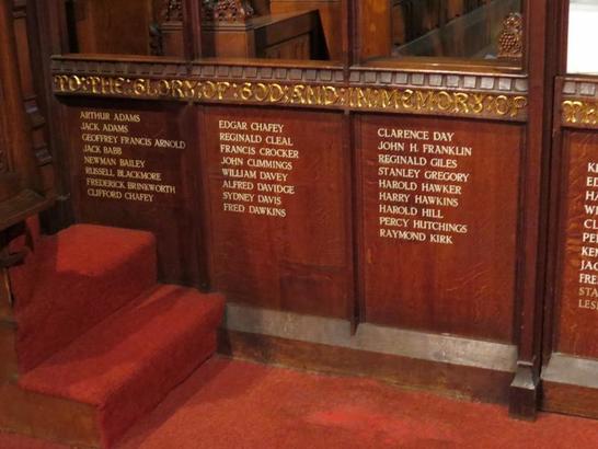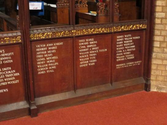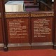 Above the canopy : /ATTENDITE AD PETRAM UNDE EXCISI ESTIS/(transl) LOOK UNTO THE ROCK WHENCE YE ARE HEWN/ Above the panels : /TO THE GLORY OF GOD AND IN MEMORY OF THE MEN WHO FELL IN THE GREAT WAR THIS SCREEN IS DEDICATED /(names) note : The names for those who fell in WW2 have been added to the central two hinged panels at a later date,