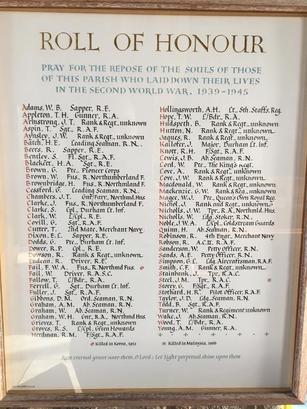 ROLL OF HONOUR/ PRAY FOR THE REPOSE OF THE SOULS OF THOSE/ OF THIS PARISH WHO LAID DOWN THEIR LIVES/ IN THE SECOND WORLD WAR, 1939 - 1945/ (69 WW2, 1 Korean War and 1 Malaysian name)/REST ETERNAL GRANT THEM O LORD; LET LIGHT PERPETUAL SHINE UPON THEM