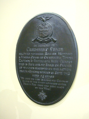 IN MEMORY OF/ CUTHBERT PEASE/ BELOVED YOUNGER SON OF HOWARD/ AND MARNA PEASE OF OTTERBURN TOWER/ CAPTAIN 1ST BATTALION IRISH GUARDS/ DIED 18 SEPT. 1916 AT BRAIE IN FRANCE/ OF WOUNDS RECEIVED IN THE ACTION/ BESIDE GINCHY, FOUGHT 15 SEPT. 1916/ AGED 24 YEARS./ "HE LOST HIS LIFE LEADING HIS COMPANY/ IN ONE OF THE FINEST ADVANCES UNDER/ HEAVY FIRE THAT HAS BEEN MADE/ IN THE WAR"