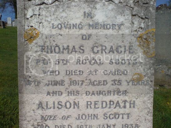 IN/LOVING MEMORY/OF/THOMAS GRACIE/PTE 5TH ROYAL SCOTS/WHO DIED AT CAIRO/14TH JUNE 1917 AGED 35 YEARS/....