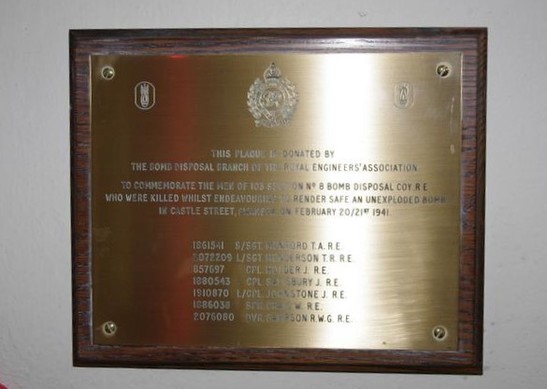 THIS PLAQUE IS DONATED BY/ THE BOMB DISPOSAL BRANCH OF THE ROYAL ENGINEERS' ASSOCIATION/ TO COMMEMORATE THE MEN OF 103 SECTION NO 8 BOMB DISPOSAL COY R. E./ WHO WERE KILLED WHILST ENDEAVOURING TO RENDER SAFE AND UNEXPLODED BOMB/ IN CASTLE STREET, SWANSEA ON FEBRUARY 20/21ST 1941./ (Names)