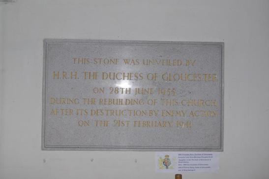 THIS STONE WAS UNVEILED BY/ H/ R/ H/ THE DUCHESS OF GLOUCESTER/ ON 28TH JUNE 1955/ DURING THE REBUILDING OF THIS CHURCH/ AFTER ITS DESTRUCTION BY ENEMY ACTION/ ON THE 21ST FEBRUARY 1941