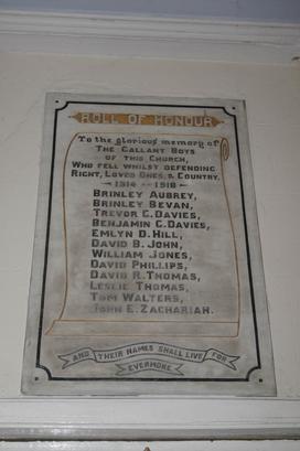 ROLL OF HONOUR/ To the glorious memory of/ THE GALLANT BOYS/ OF THIS CHURCH,/ WHO FELL WHILST DEFENDING/ RIGHT, LOVED ONES, & COUNTRY,/ 1914 - 1918/ (Names)/ AND THEIR NAMES SHALL LIVE FOR / EVERMORE.