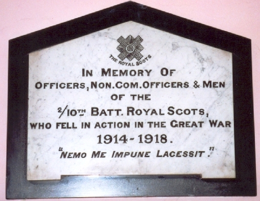 IN MEMORY OF/OFFICERS, NON. COM OFFICERS & MEN/OF THE/2.10TH BATT. ROYAL SCOTS/WHO FELL IN ACTION IN THE GREAT WAT/1914-1918/"NEMO ME IMPUNE LACESSIT"