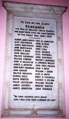 TO GOD BE THE GLORY/REMEMBER/THE MEN OF WALLACE GREEN CHURCH/WHO GAVE THEIR LIVES FOR THEIR COUNTRY/IN THE GREAT WAR 1914-1919/[36 names]/"BE THOU FAITHFUL UNTO DEATH/AND I WILL GIVE THEE A CROWN OF LIFE"