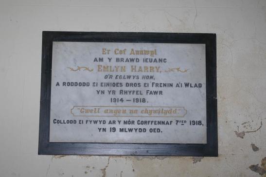 Er Cof Annwyl/ AM Y BRAWD IEUANC/ EMLYN HARRY,/ O'R EGLWYS HON,/ A RODDODD EI EINIOES DROS EI FRENIN A'I WLAD/ YN YR RHYFEL FAWR/ 1914 - 1918./ "Gwell angeu na chywilydd,"/ COLLODD EI FYWYD AR Y MOR CORFFENNAF 7 FED 1918,/ YN 19 MLWYDD OED.