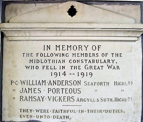 IN MEMORY OF/ THE FOLLOWING MEMBERS OF THE/ MIDLOTHIAN CONSTABULARY/ WHO FELL IN THE GREAT WAR/ 1914-1919/ (3 names)/ THEY WERE FAITHFUL IN THEIR DUTIES/ EVEN UNTO DEATH