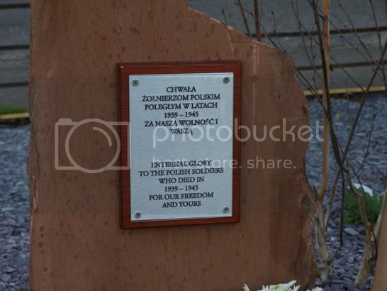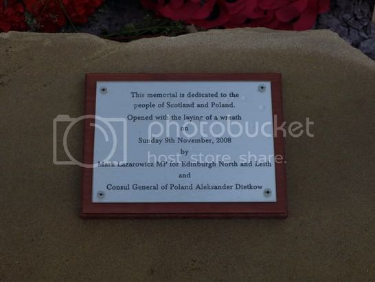 Plaque 1-[first is the Polish version of the English text]- ENTERNAL [sic] GLORY/TO THE/POLISH SOLDIERS/WHO DIED IN/1939-1945/FOR OUR FREEDOM/AND YOURS Plaque 2-THEY SHALL NOT GROW OLD/AS WE THAT ARE LEFT GROW/OLD//AGE SHALL NOT WEARY THEM/NOR THE YEARS CONDEMN//AT THE GOING DOWN OF THE SUN AND IN THE MORNING//WE WILL REMEMBER THEM//Dedicated to the brave Men and/Women who gave so much for our/freedom. Plaque 3 (on the flat stone)- This memorial is dedicated to the/people of Scotland and Poland.//Opened with the laying of a wreath/on/Sunday 9th November, 2008/by Mark Lazarowicz MP for Edinburgh North and Leith/and/Consul General of Poland Alexander Dietkow