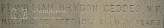 In loving memory of Catherine Hay Brydon wife of George Watson Geddes died at Ramheugh Cottage Castle Dykes 20th Oct 1920 aged 66 and his sons Pt William Brydon Geddes N.F missing 11th Sept 1917 aged 31 Pt George Watson Geddes KOSB missing 11th April 1918 aged 23 also the said George Watson Geddes died at Ramheugh 22nd Nov 1939 in his 83rd year and his daughter Jeanie Brydon Geddes who died 7th Jan 1956 in her 78th year.