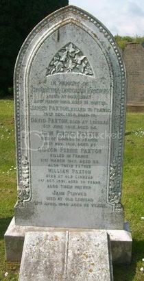 In memory of Christina Douglas Paxton died at Weatherly 25th March 1899 aged 3 1/2 months, James Paxton killed in France 19th December 1914 aged 19, David Paxton died at Linhead 6th June 1915 aged 24, John Purves Paxton died of wounds in France 26th November 1916 aged 28, Gideon Perrie Paxton killed in France 21st March 1917 aged 23 also their father William Paxton died at Old Linhead 1st October 1931 aged 70 also their mother Jane Purves died at Old Linhead 11th April 1940 aged 72.