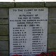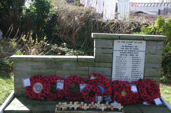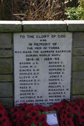 TO THE GLORY OF GOD/ AND/ IN MEMORY OF/ THE MEN OF TONNA/ WHO MADE THE SUPREME SACRIFICE/ DURING WORLD WARS/ 1914-18/ (Names)/ 1939-45/ (Names)/ AT THE GOING DOWN OF THE SUN AND IN/ THE MORNING WE WILL REMEMBER THEM
