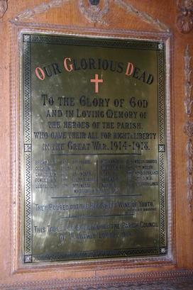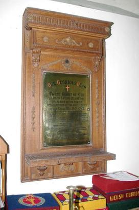 OUR GLORIOUS DEAD/ TO THE GLORY OF GOD/ AND IN LOVING MEMORY OF/ THE HEROES OF THE PARISH,/ WHO GAVE THEIR ALL FOR RIGHT & LIBERTY/ IN THE GREAT WAR 1914 - 1918./ (Names)/ "THEY POURED OUT THE RED SWEET WINE OF YOUTH."/ RUPERT BROOKE./ THIS TABLET IS ERECTED BY THE PARISH COUNCIL/ OF LLANTWIT LOWER 1919.
