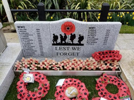 Left Hand Panel-WW2/[17 names] Central Panel- LEST WE/FORGET Right Hand Panel- WW1/[9 names]