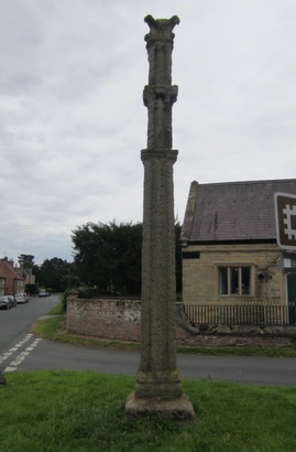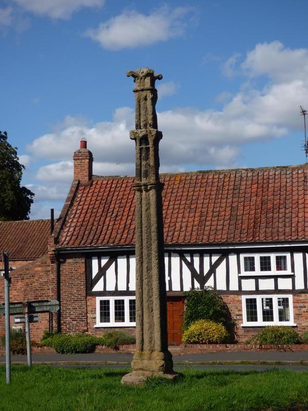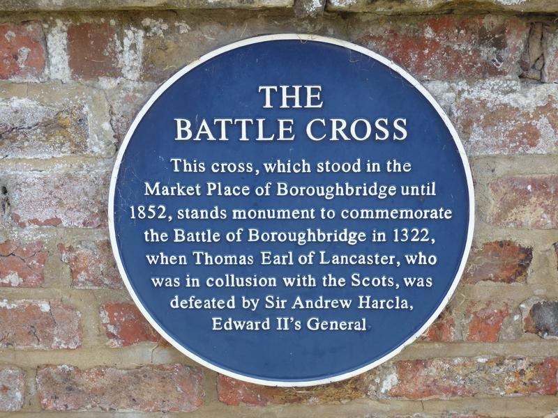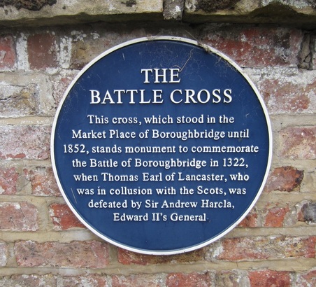THIS CROSS, WHICH STOOD IN THE/ MARKET PLACE OF BOROUGHBRIDGE UNTIL/ 1852, STANDS MONUMENT TO COMMEMORATE/ THE BATTLE OF BOROUGHBRIDGE IN 1322, WHEN THOMAS EARL OF LANCASTER, WHO/ WAS IN COLLUSION WITH THE SCOTS, WAS/ DEFEATED BY SIR ANDREW HARCLA,/ EDWARD II'S GENERAL