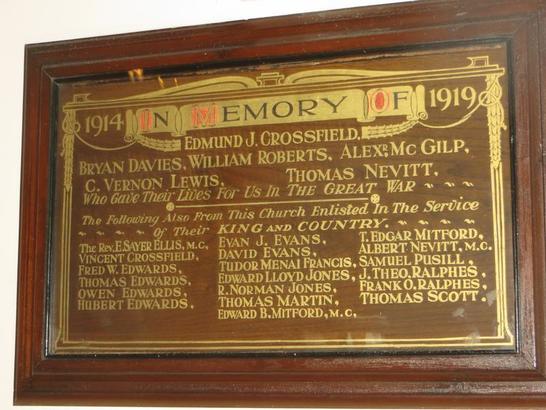 1914 IN MEMORY OF 1919/[6 names]/Who gave their lives for US IN THE GREAT WAR/The Following Men From This Church Enlisted In The Service/of Their KING AND COUNTRY/[19 names in 3 columns]
