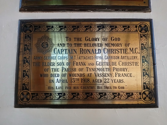 TO THE GLORY OF GOD/ AND TO THE BELOVED MEMORY OF/ CAPTAIN RONALD CHRISTIE, M.C./ ARMY SERVICE CORPS (M.T.) ATTACHED ROYAL GARRISON ARTILLERY./ BELOVED SON OF FRANK AND GERTRUDE CHRISTIE/ OF THE PARISH OF TYNEMOUTH PRIORY,/ WHO DIED OF WOUNDS AT VASSENY, FRANCE,/ IN APRIL 13TH 1918, AGED 22 YEARS./ "HIS LIFE FOR HIS COUNTRY, HIS SOUL TO GOD"