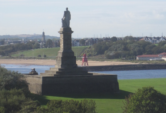 THIS MONUMENT/WAS ERECTED IN 1845 BY PUBLIC SUBSCRIPTION TO THE MEMORY OF/ADMIRAL LORD COLLINGWOOD/WHO IN THE "ROYAL SOVEREIGN" ON THE 21ST OCTOBER 1805, LED THE BRITISH FLEET/INTO ACTION AT TRAFALGAR AND MAINTAINED THE SEA FIGHT FOR UPWARDS OF AN HOUR/BEFORE THE OTHER SHIPS WERE WITHIN GUN SHOT, WHICH CAUSED NELSON TO EXCLAIM/"SEE HPW THAT NOBLE FELLOW COLLINGWOOD TAKES HIS SHIP INTO ACTION"/_______/HE WAS BORN AT NEWCASTLE-UPON-TYNE AND DIED IN THE SERVICE/OF HIS COUNTRY, ON BOARD THE "VILLE DE PARIS" ON 7TH MARCH 1810/AND WAS BURIED IN ST PAUL'S CATHEDRAL/____/THE FOUR GUNS UPON THIS MONUMENT BELONGED TO HIS SHIP THE "ROYAL SOVEREIGN"