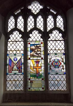 CENTRE LIGHT : DUTY WITHOUT HATE / IN MEMORIAM / OUR COMRADES OF THE / 401ST BOMBARDMENT RIGHT HAND LIGHT : 401ST BOMBER GROUP / 1939-1945 / TO WELDON PARISH CHURCH / "HE HATH DELIVERED MY SOUL / IN PEACE FROM THE BATTLE / THAT WAS AGAINST ME / FOR THERE WERE MANY WITH ME"