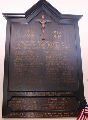 1914 - 1918 1939 - 1945 IN HONOURED MEMORY OF THE MEN OF THIS PARISH WHO GAVE THEIR LIVES IN THE GREAT WAR (Names) THEIR NAME LIVETH FOR EVERMORE AND OF THOSE WHO MADE THE SUPREME SACRIFICE IN THE SECOND WORLD WAR (Names) GREATER LOVE HATH NO MAN THAN THIS AND ALSO OF CHARLES GUMM JR USAAF WHO LOST HIS LIFE IN AVOIDING DAMAGE TO THIS VILLAGE 1944